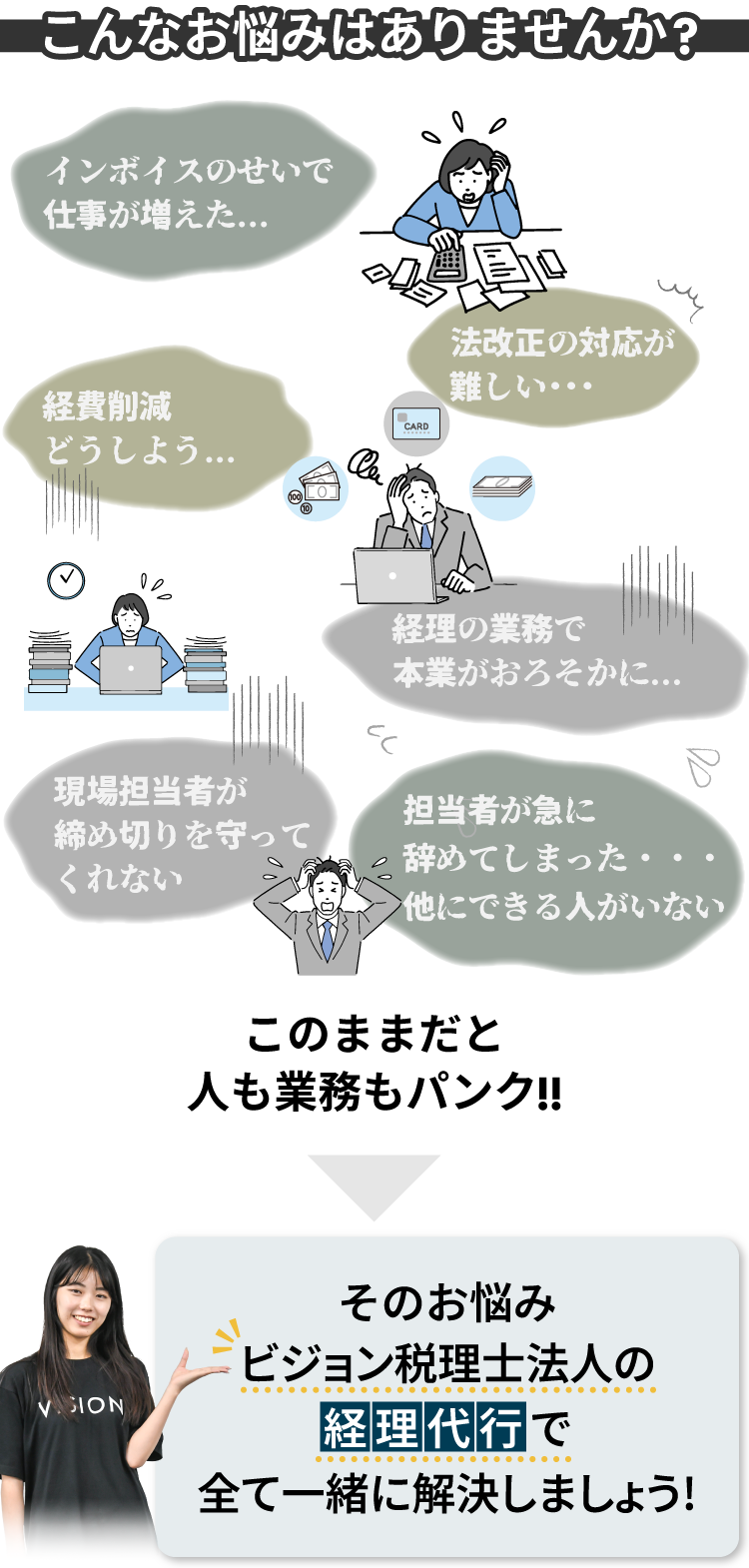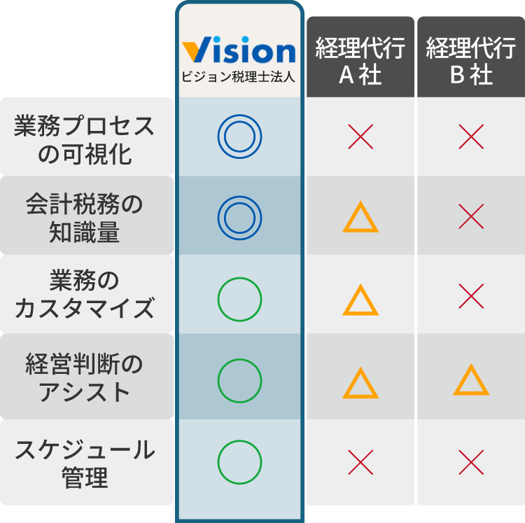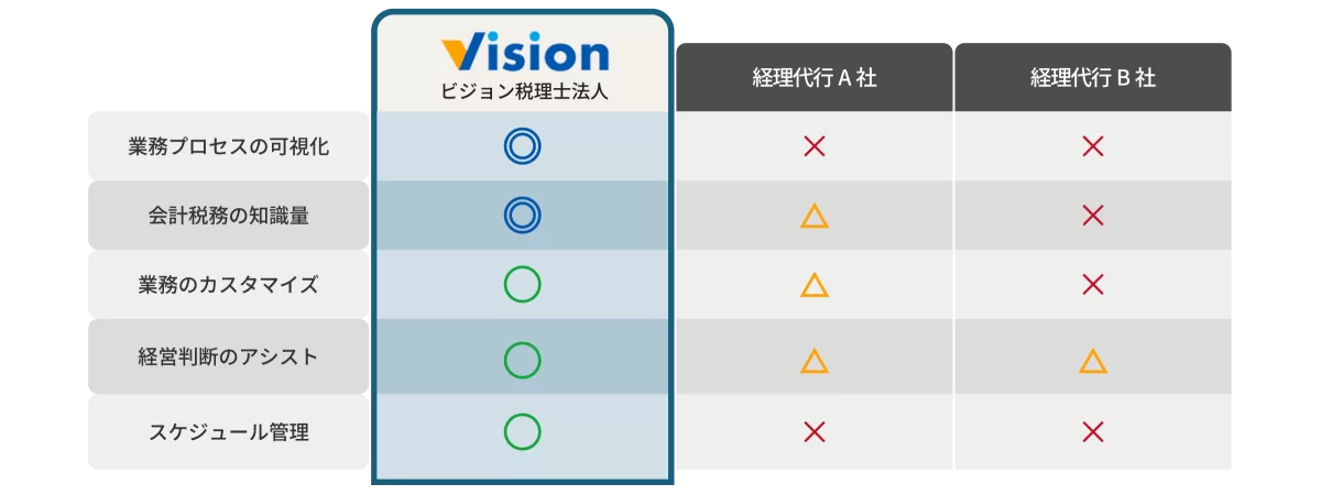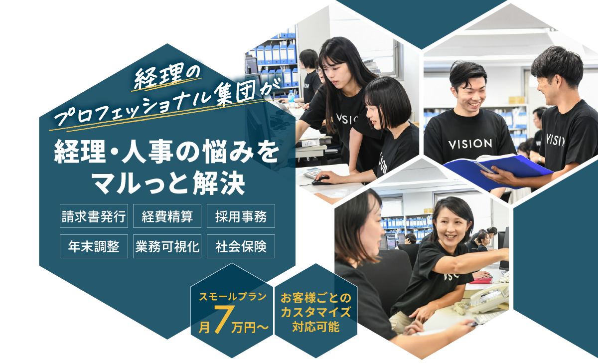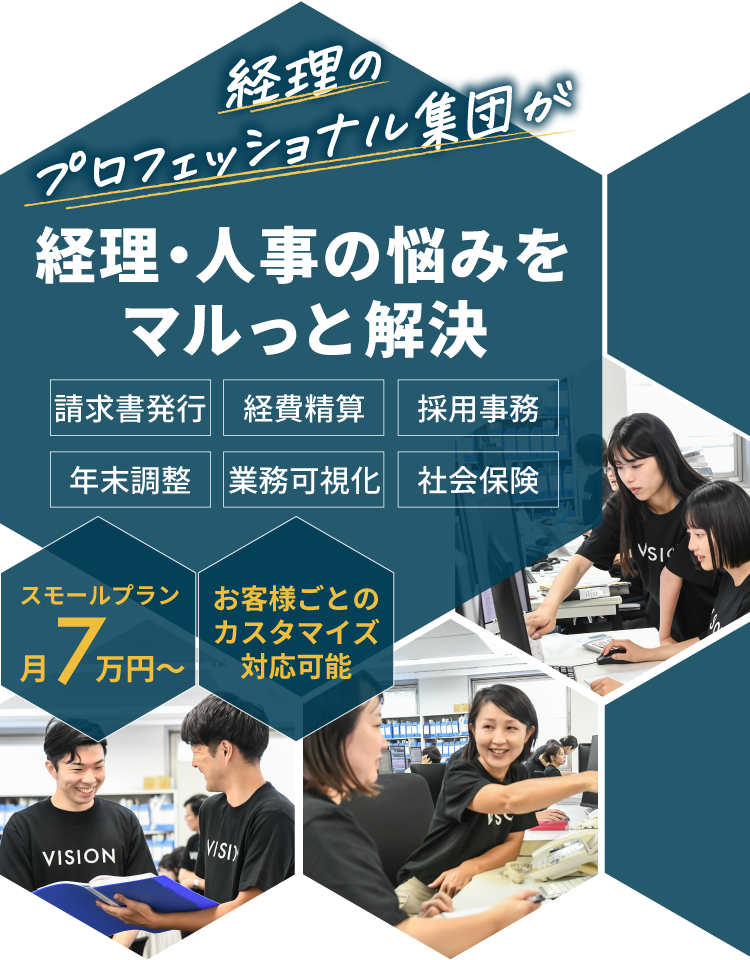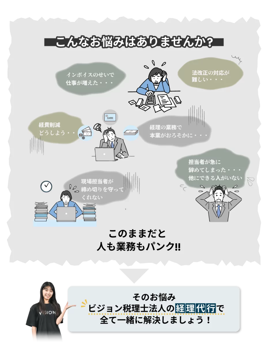 無料問い合わせ 無料問い合わせ 0120-998-707 私たちの強み Feature 01 会計のプロフェッショナルが支える安心感 信頼できるプロの知識で経理業務を丸ごと安心して任せたい方に 創業20年以上の会計事務所による正確で効率的な経理処理を提供します。最新の法改正にも迅速に対応し、必要に応じて経営判断をサポートします。さらに、グループ内には社労士事務所もございますので、人事・労務に関する悩みもワンストップで解決できます。 02 業務量に応じた柔軟な料金体系 依頼内容に応じて費用を最適化 当社の料金体系は作業時間ではなく、依頼いただく業務量に応じた柔軟な料金設定です。さらに、代行が必要なサービスだけを依頼できるため、時期によって依頼する業務量に差がある場合でも、余分な費用をかけることなく安心してご利用いただけます。 03 社内経理担当者と同等のコストでプロの品質を コストを抑えつつ業務の質を劇的に向上 社内経理担当者と同等のコストで、専門家による高品質な業務を提供します。その品質は社内業務を大きく超えた専門性と正確さを誇ります。ミスの防止や効率の向上だけでなく、経理業務全体のクオリティを底上げすることができます。 04 「解約後も続く」業務の脱属人化 誰が辞めても業務が滞らない理想の仕組みを作りたい方に 業務フローチャートや作業マニュアルを整備し、誰でも対応可能な体制を構築します。解約後もこの仕組みを活用すれば、社内担当者の変更にも柔軟に対応できます。結果として、社内での属人化を防ぎ、長期的な業務の安定運営が可能になります。 サービスメニュー Service Menu ビジョン税理士法人の経理代行では、下記の業務をお引き受けいたします。 経理業務 ・経費精算 ・請求書発行 ・振込、支払登録 経理業務一覧へ 人事労務 ・人材採用の補助 ・年末調整 ・入退社手続き ・社会保険 人事労務一覧へ 業務可視化 ・フローチャート、マニュアルのご提案 ・業務の交通整理 ・仕組み作りのサポート 業務可視化へ これら以外にもマニュアルにおとしこめる社内業務なら、相談次第でサポート可能!お気軽にご相談ください。 サービスの流れ Work Flow STEP1 お問合せ・ご相談 まずはお気軽にご連絡ください。親切・丁寧に対応させていただきます。ご連絡いただいた際に、ご都合の良い日をお伝えください。 STEP2 無料相談&業務ヒアリング ご予約いただいた日程で、相談を実施します。そこで、経理ご担当者様の現状の業務等を把握させていただきます。 STEP3 ご提案&お見積り お伺いした内容をもとに、弊社にお任せいただく場合の業務内容とそれにかかるスケジュールや費用をご提案させていただきます。また、お客様の経理業務を可視化して弊社が代行するメリットについてご説明させていただきます。その際、業務の分担やお客様からの細かなご希望をお伺いし、経理業務を代行する上でのルールを決めさせていただきます。 STEP4 トライアル期間(1ヶ月程度) 本契約に入る前に、まずは小規模でのトライアルを行います。ヒアリング内容をもとに作成したフローチャートやマニュアルをもとに、業務フロー・作業工程のすり合わせを行います。実際に運用して見つかるお客様の新たなご要望をお聞きし、より効率的な業務プロセスを構築させていただきます。 STEP5 ご契約・業務開始 ご提案させていただいた内容で合意いただき、詳細な内容が固まりましたら、本契約に移行させていただきます。本契約後も引き続き規模を徐々に拡大させながら、ご依頼いただいた業務を代行させていただきます。通常、開始まで2〜3ヶ月程度かかります。お急ぎの場合は、ご相談ください。 無料問い合わせ 無料問い合わせ 0120-998-707 料金プラン Plan プラン内容月額 スモール売上請求書作成・回収確認・経費精算・記帳代行 ・一部の業務のみ依頼7万円/月〜 ミディアム売上1億円の法人の経理代行20万円/月〜 ラージ売上1億円超の法人様の経理代行30万円/月〜 弊社では時給換算での料金設定はしておりません。ご依頼いただいた業務内容・業務量に応じて、料金が変動します。いずれも別途初期構築費用(トライアル作業分も含む)として300,000〜500,000円が発生いたします。 例1)請求書発行 毎月100社程の請求書発行・集計 ■案件管理・メンテナンスコスト・毎月の定例会議等保守料 50,000円 ■請求書発行作業と集計 30,000円~50,000円 合計:80,000円~100,000円 例2)経費精算 毎月150件程の経費申請処理の代行 ■案件管理・メンテナンスコスト・毎月の定例会議 50,000円 ■申請作業・修正作業・督促対応 50,000円~100,000円 合計:100,000円~150,000円 例3)税金や支払先の振込予約 毎月50件程の支払先登録 ■案件管理・メンテナンスコスト・毎月の定例会議等保守料 50,000円 ■請求書発行作業と集計 20,000円~50,000円 合計:70,000円~100,000円 例4)人材採用の補助 毎月100名程の応募者対応の代行 ■案件管理・メンテナンスコスト・毎月の定例会議 50,000円 ■メール対応・面談者との日程調整 30,000〜100,000円 