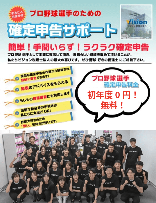 まずは1年間、お試しでビジョン税理士法人に、プロ野球選手の確定申告(初年度無料サービス)に依頼してみませんか?